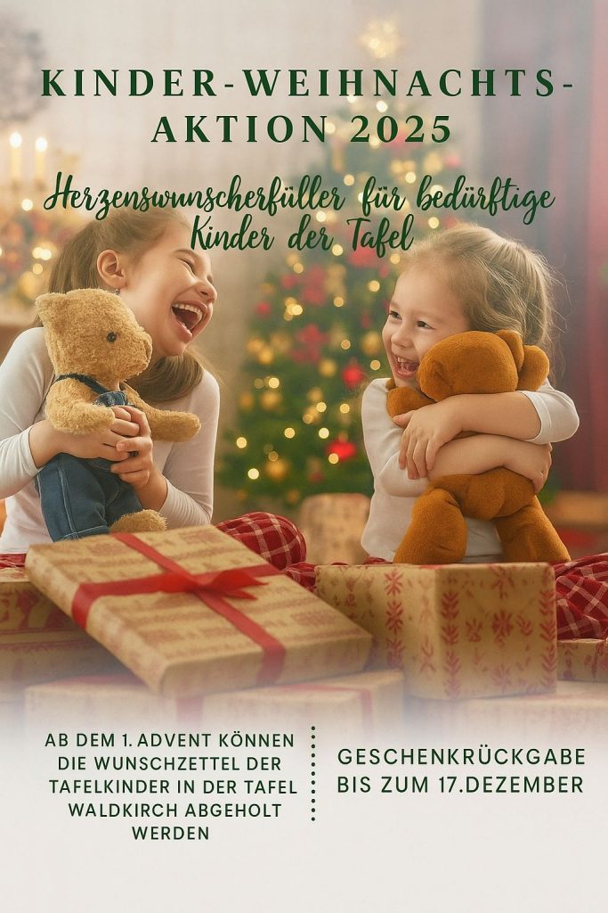 Die Geschenke bitte dann wieder bis spätestens 17.12.2025 an die Tafel zurück bringen. Die ehrenamtlichen Helfer der Tafel werden diese am Montag, den 22.12.2025 von 10:00 bis 12:00 Uhr an die Kinder verteilen.